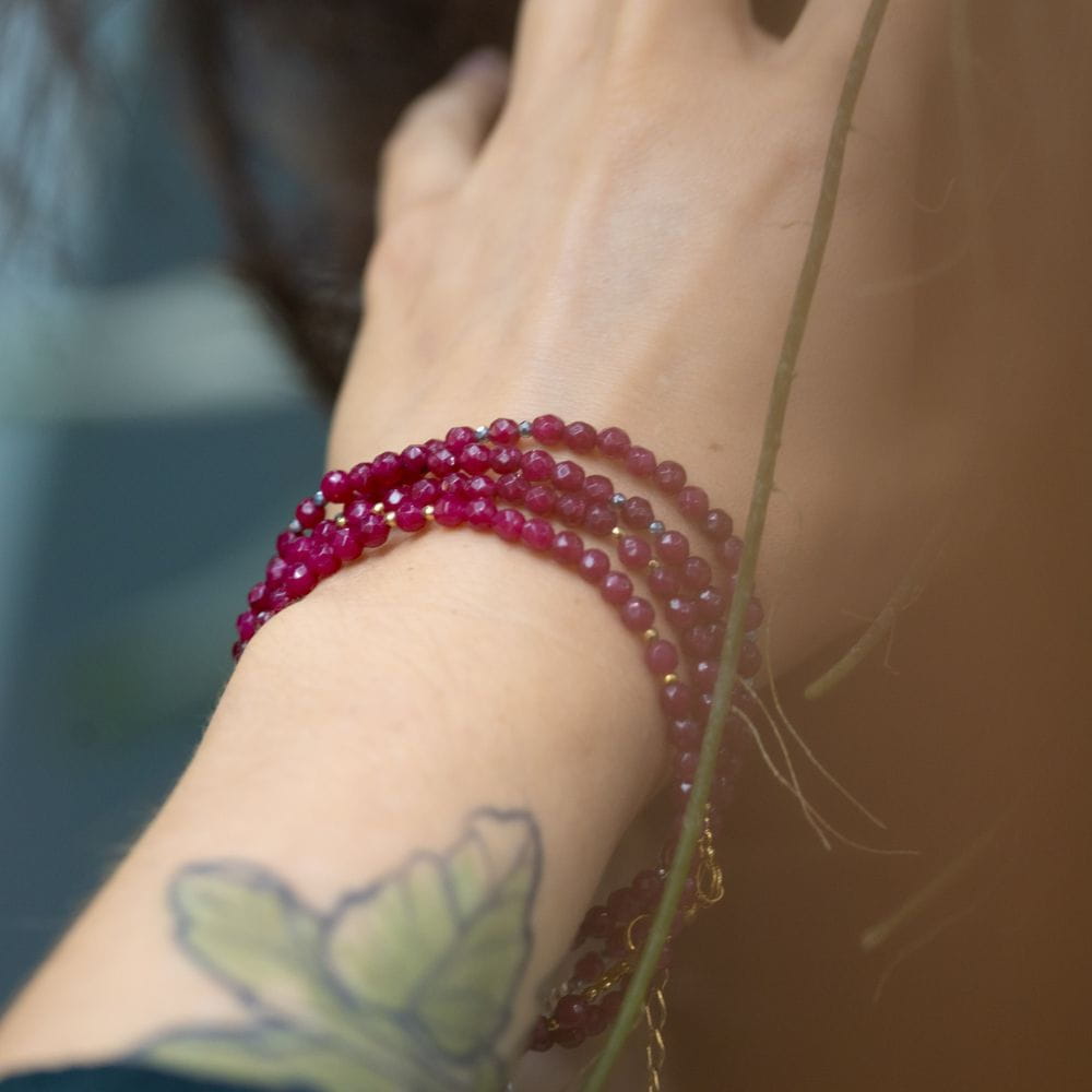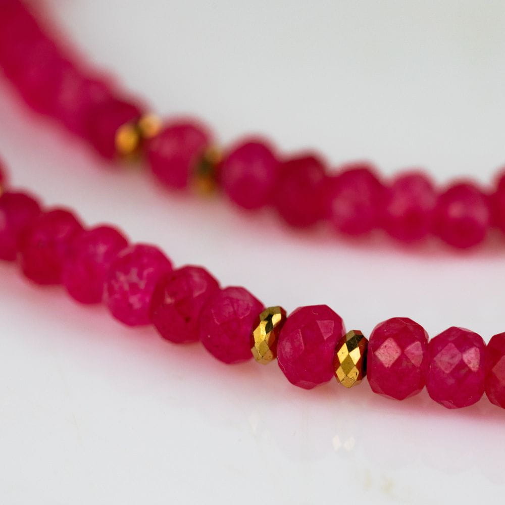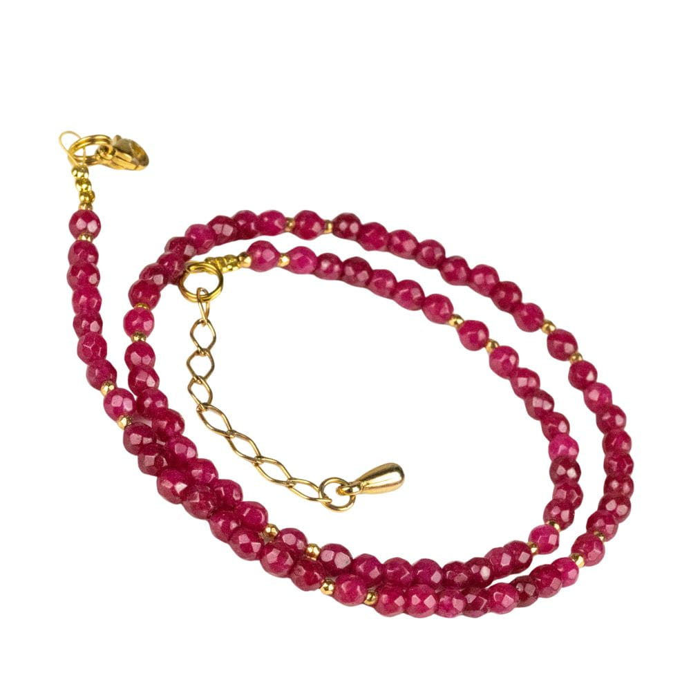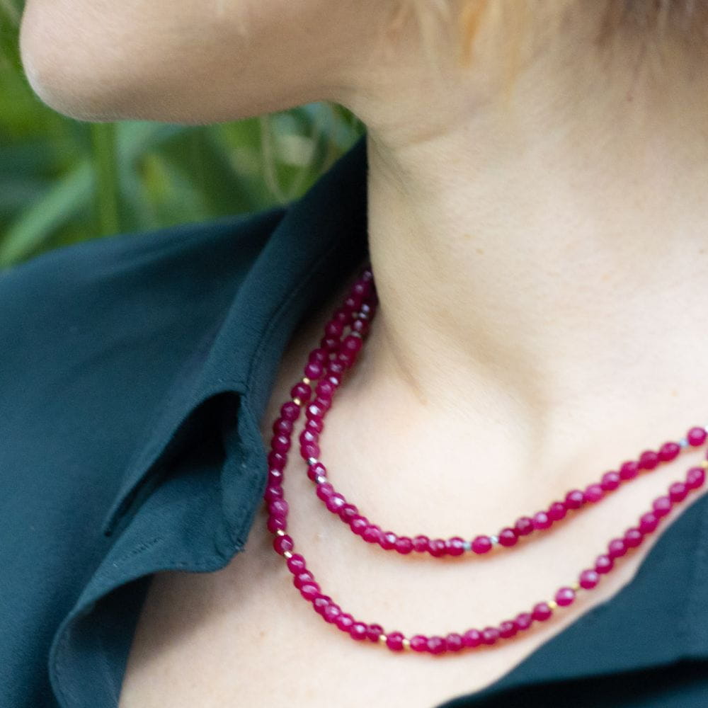 Ten naszyjnik od razu przyciąga wzrok. Rubelity mają intensywny, malinowo-różowy kolor, który na żywo wygląda jeszcze lepiej niż na zdjęciach. Facetowane kulki subtelnie odbijają światło przy każdym ruchu. Efekt? Delikatny błysk, który nie krzyczy, tylko robi wrażenie.